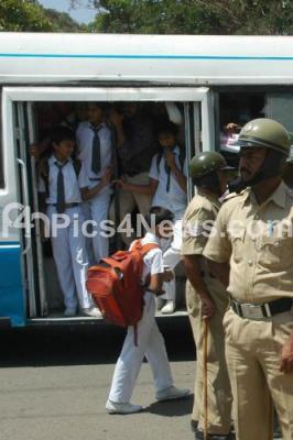Photo Caption : Students trying to catch a bus after their exams near Gandhi Statue as the police kept a tight vigilance for the media protest rally, in Bangalore on Saturday 3rd March 2012