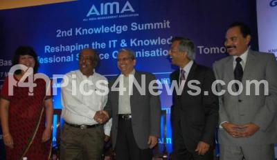 Photo Caption : K Jairaj, Additional Chief secretary with Kris Gopalakrishnan, Executive co chairman, Infosys Technologies. Rekha Sethi, Director General, All India Management Association and Others seen in 2nd Knowledge Summit Reshaping the IT and Knowledge based Professional Service Organizations of Tomorrow, in Bangalore on Wednesday 7th March 2012