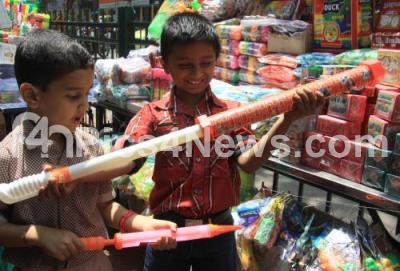 Photo Caption : Children seen buying Colors and Water guns on the occasion of Holi festival, in Bangalore on Wednesday 7th March 2012