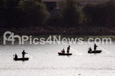 Photo Caption : At sunrise fishermen seen trying to place their fishing nets to catch some fishes abd to make their living at Madiwala Lake in BTM Layout, in Bangalore on Friday 9th March 2012