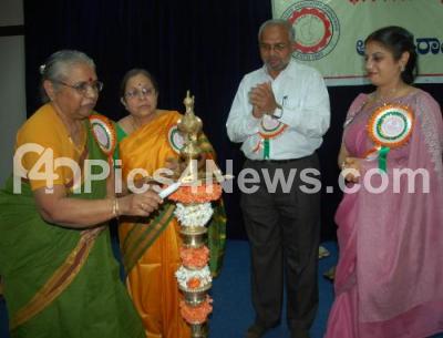 Photo Caption : Dr Kamala Hampanna Lighting Lamp with BS Ravindra, President State bank officers association, Vijaya Kathavathe, Ladies Representative Association of State Bank of India and Sangeethe Mehra, on the Occasion Womens Day at State Bank of India, in Bangalore on Saturday 10th March 2012