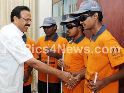 Photo Caption : Blind students wished CM DV Sadananda Gowda on his 59th birthday celebration, in Bangalore on Sunday 18th March 2012