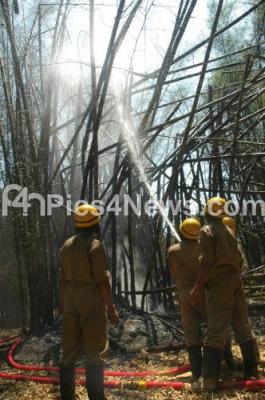 Photo Caption : Firemen trying to doze off the fire which had caught in bamboo garden at Cubbon Park, in Bangalore on Sunday 18th March 2012