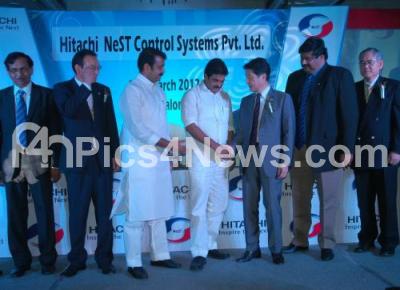 Photo Caption : KC Venugopal, State Central Power Minister greeting with Shigeru Sugiyama, Chairman of Hitachi NeST Control Systems, Jehangir, Vice Chairman and Managing Director of SFO technologies, NA Harris, MLA and others at the Inauguration of Hitachi at Taj Western, in Bangalore on Monday 19th March 2012
