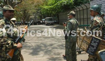 Photo Caption : Rapid Action Force seen during the Advocates protest at City Civil Court, in Bangalore on Tuesday 20th March 2012