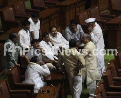 Photo Caption : DK Shivakumar, Congress Leader, Interacting with BJP MLAs and Ministers during the Assembly Session at Vidhana Soudha, in Bangalore on Tuesday 20th March 2012