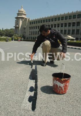 Off Beat Photo - Sunday duty for Traffic Police, Painting Traffic Lines at Vidhana Soudha, in Bangalore on Sunday 18th Nov 2007 Pics: www.pics4news.com
