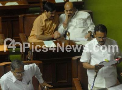 Photo Caption : DV Sadananda Gowda, Chief Minister of Karnataka addressing with Ministers S Suresh Kumar, Ramdas and Basavaraj Bommai during the assembly session at Vidhana Soudha, in Bangalore on Tuesday 27th March 2012