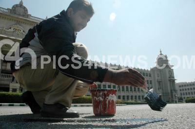 Photo Caption : Off Beat Photo - Sunday duty for Traffic Police, Painting Traffic Lines at Vidhana Soudha, in Bangalore on Sunday 18th Nov 2007 Pics: www.pics4news.com