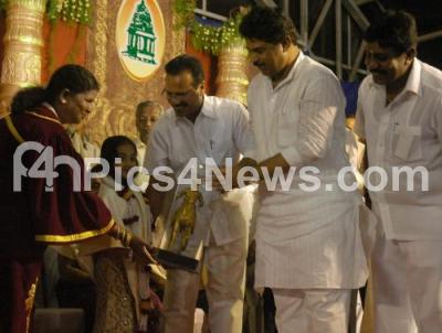 Photo Caption : DV Sadananda Gowda, Chief minister of Karnataka with Sharadamma, Mayor, Harish, Deputy Mayor and R Ashok, Minister presenting the Award to 6 year old Chess Player at the Award Function on Kempegowda Day Celebration 2012 at BBMP Glass House, in Bangalore on Friday 6th April 2012