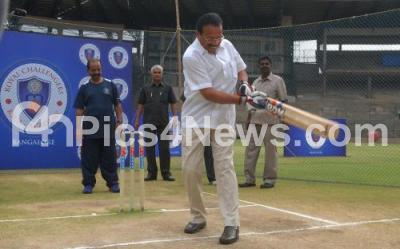 Photo Caption : DV Sadanada Gowda, Chief Minister of Karnataka seen playing cricket during the inauguration of Royal Challengers KSCA Academy at Chinnaswamy Stadium, in Bangalore on Monday 18th June 2012