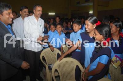 Photo Caption : Vishweshvaraiah Hegde Kageri, Minister seen interacting with students during the Vignana Yathre Programme, organized by Intel at Shikshakara Sadhana, in Bangalore on Wednesday 27th June 2012