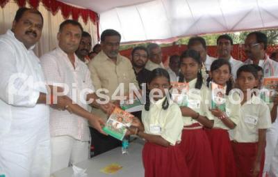 Photo Caption : MLA Dinesh Gundu Rao and Congress Leader Ramesh distributing note books to government school children on the occasion of Union Minister Mallikarjuna Kharge 71st birth day celebrations, organized by P Ramesh Welfare Charitable Trust at Tilak Nagar, in Bangalore on Sunday 22nd July 2012