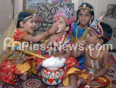 Childen seen enacting the role of Krishna and family on the occasion of Krishna Janmashtami, in Bangalore on Wednesday 8th August 2012