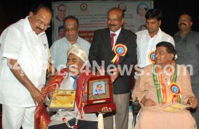 Photo Caption : Veerappa Moily, Union Minister with Ajith Jogi, Former Chief Minister, Chattisgad and others felicitating during the Presentation of Dr Ambedkar and Devaraj Urs Award at Yavanika Auditorium, in Bangalore on Sunday 12th August 2012