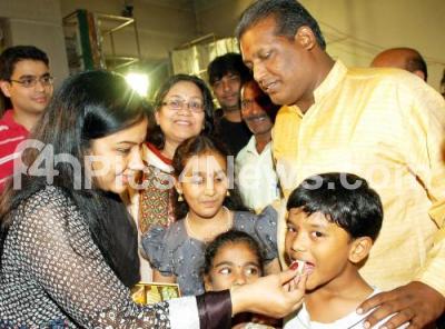 Photo Caption : Tara, Actress feeding sweets to children, during her visit to Gangamma Temple at Cox Town, in Bangalore on Sunday 12th August 2012