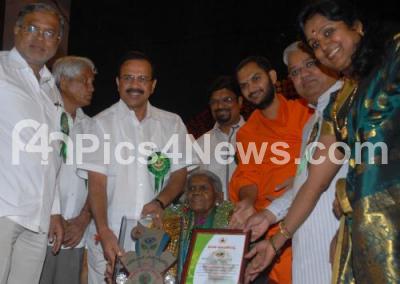 DV Sadananda Gowda, Former Chief Minister of Karnataka presenting Parisara Maharatna Award to Saalu Marada Thimmakka, with Ministers S Suresh Kumar, Govind Karajole, MLC Ramachndra Gowda and others, organized by Bharata Yuva Kendra at Town Hall, in Bangalore on Wednesday 22nd August 2012