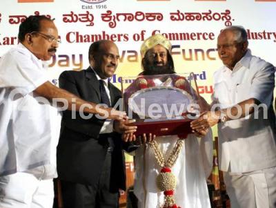 Photo Caption : Sri Ravishankar Gurudev being felicitated by Sir M Visvesvaraya Award from Veerappa Moily, Union Minister with BS Yeddyurappa, Former Chief Minister, Shiva Shanmugam, President, FKCCI during the Founders Day Award Ceremony, organized by FKCCI at Hotel Ashoka, in Bangalore on Monday 1st October 2012