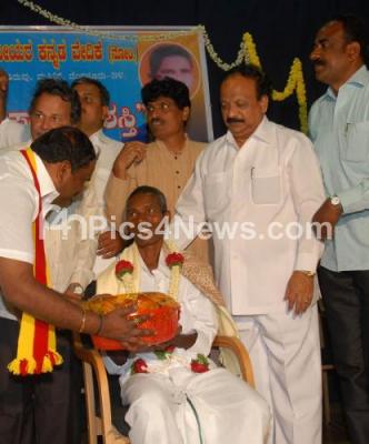 Photo Caption : Nadoja Dr Baragur Ramachandrappa presenting " Sri Ramzan Saheb" award to Harekala Hajabba at a award programme oragnised by Akila Karnataka Mahamadiyara Kannada Vedike at Kannada Sahitya Parishat, also seen MLA Roshan Baig, KARAVE Preseident Narayana Gowda, T Thimmesh and others, in Bangalore on Sunday 7th October 2012