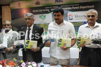 Photo Caption : PJ Dilip Kumar, Director General of Forests with CP Yogeshwar, Forest minister, R Sridharan, principal Secretary, Forest Department seen releasing Karnataka E Green Watch Aranya Bhavan, in Bangalore on Thursday 11th October 2012