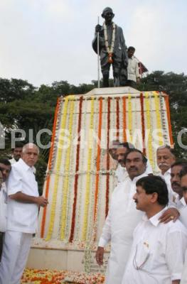 Photo Caption : BS Yeddyurappa, Former CM offering flowers to Gandhi Statue after submitting his resignation to Governor Rameshwar Thakur, in Bangalore on Monday 19th Nov 2007 Pics: www.pics4news.com