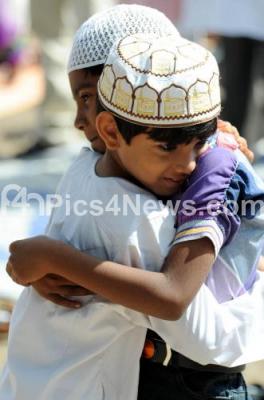 Photo Caption : Children seen greeting each other, after the Eid Ul Azha Namaz at Chamarajpet Idgah Maidan, in Bangalore on Saturday 27th October 2012