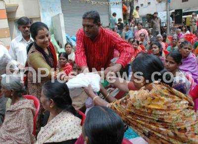 Photo Caption : Tara, Chairperson, Karnataka Film Academy distributing free Sarees and Sweets to poor women for Deepavali Festival, organized by Bharatinagar Residents Forum led by NS Ravi at Gangamma Temple, Coxtown, in Bangalore on Thursday 8th November 2012