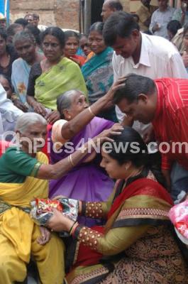 Event Description : Tara, Chairperson, Karnataka Film Academy and NS Ravi, President , Bhartinagar Residents Forum taking blessings from poor Women, while distributing free Sarees and Sweets for Deepavali Festival, organized by Bharatinagar Residents Forum led by NS Ravi at Gangamma Temple, Coxtown, in Bangalore on Thursday 8th November 2012