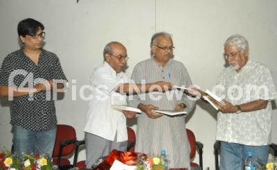 Photo Caption : Prof MH Krishnaiah with HS Venkatesh Murthy, Poet, SG Vasudev, Senior Artist seen releasing Anukta and Kannele by Ravikumar Kashi at Venkatappa Art Gallery, in Bangalore on Thursday 8th November 2012