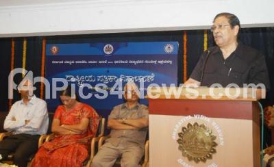 Photo Caption : Justice N Santhosh Hegde adressing seminar on Freedom of Press with HR Ranganath, Journalist, R Poornima, Senior Journalist and others, during National Press Day at Bharatiya Vidya Bhavan, in Bangalore on Friday 16th November 2012