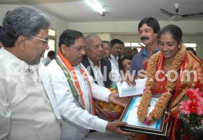 Photo Caption : N Shweta, Volleyball Player being honoured, on the occasion of Indira Gandhi, Late Former Prime Ministers 95th Birth Anniversary at KPCC, in Bangalore on Monday 19th November 2012