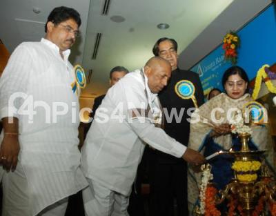Photo Caption : KH Muniyappa, Union Minister lighting lamp with R Ashok, Deputy Chief Minister, Namo Narain Meena, Minister of State for Finance and others to ianugurate Canara Bank Founders Day Celebration, Minute to Minute programme at Hotel Lalith Ashok, in Bangalore on Monday 19th November 2012