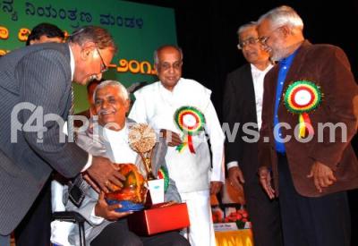 Photo Caption : Dr HC Saraschandra, Former President, Karnataka State Pollution Control Board being honored by Environmental Award by Dr Vaman Acharya, President, KSPCB, Dr M Chidananda Murthy, AJ Sadashivaiah, Former President, KSPCB and others during the Environmental Award Ceremony at Kuvempu Kalakshetra, in Bangalore on Wednesday 28th November 2012