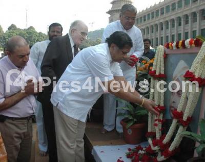 Photo Caption : Jagadish Shettar, Chief Minister with M Govind Karjol, Cultural Minister and others offering floral tribute to Kengal Hanumanthaiah, to mark his 32nd death anniversary at Vidhana Soudha, in Bangalore on Saturday 1st December 2012