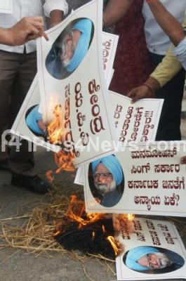 Photo Caption : Members of JDu burning the placards of Dr Manmohan Singh, Prime Minister of India, protesting against Supreme Court Order to release Cauvery Water to Tamil Nadu, protest held at Town Hall, in Bangalore on Thursday 6th December 2012