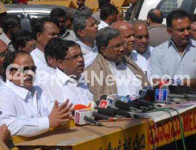 Photo Caption : Congress Leaders Siddharamaiah, Opposition Leader with G Parmeshwar, KPCC President, Roshan Baig, MLA and others addressing media after submitting memorandum to Governor HR Bhardwaj, to dissolve BJP Government at Raj Bhavan, in Bangalore on Saturday 15th December 2012