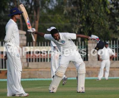 Photo Caption : Karnataka Player CM Gautham celebrates his century against Vidharba Team, during the Ranji Trophy Match between Karnataka and Vidharba at Gangothri Glades Cricket Ground, in Mysore on Saturday 15th December 2012
