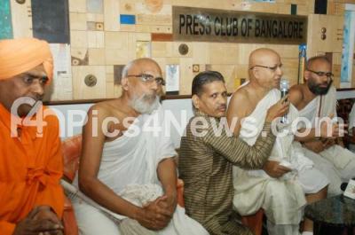 Photo Caption : Jainacharya Shri Rajyashsuriswaji Maharaj addressing media regarding the Shakahar Sandesh Pada Yatra, with Dayanand Swamiji, Devkumar Jain and others at Press Club, in Bangalore on Saturday 22nd December 2012