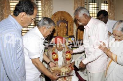 Photo Caption : Govind Karjol, Minister with Pundalika Halambi, President, Kannada Sahitya Parishath and others felicitated JS Shivarudrappa, National Poet, after his recovery, during their visit to his residence, in Bangalore on Wednesday 2nd January 2013