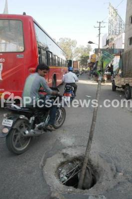 Photo Caption : Open Manholes, a cause of accidents, yet unseen by civic authorities at Siddhaiah Road, Near Urvashi Theatre, in Bangalore on Wednesday 2nd January 2013
