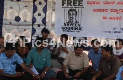 Members of Forum Against Illegal Arrests of Journalist protest in support of Naveen Soorinje, Mangalore Reporter, who was arrested as he covered the telecast of homestay attack in Mangalore, protest held at Freedom Park, in Bangalore on Saturday 5th January 2013