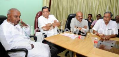 Photo Caption : Jagadish Shettar, Chief Minister discussed with HD Devegowda, Former Prime Minister, on the Cauvery Verdict, also seen Basavaraj Bommai, Water Resource Minister, S Suresh Kumar, Law Minister and others at Home Office Krishna, in Bangalore on Tuesday 8th January 2013