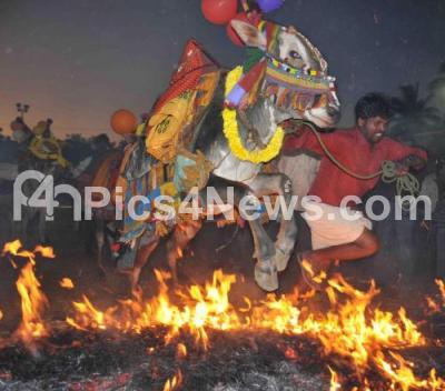 Photo Caption : People celebrate Fire Jump with Cattles, on the occasion of Makara Sankranti Festival at Kattariguppe, in Bangalore on Tuesday 15th January 2013