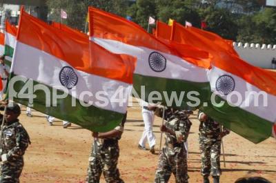 Photo Caption : Students dressed as Military hoist National Flags, celebrating the 64th Republic Day at Manekshaw Parade Grounds, in Bangalore on Saturday 26th January 2013