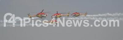 Photo Caption : Sarang Helicopters perform aerobatic flight during AeroIndia 2013 at Yelahanka air base, in Bangalore on Thursday 7th February 2013