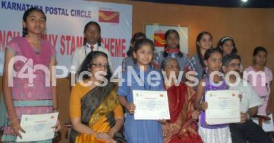 Photo Caption : Hilda Abraham, Chief Postmaster General, Karnataka Postal General, Karnataka with Veena Srinivas, Postmaster General, K Prakash, Director Postal Services seen with the Winners of Design a Stamp Contest at GPO, in Bangalore on Thursday 7th February 2013