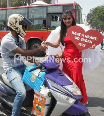 Photo Caption : PeTAs Valentine Angel presents rose to the passerby with a message Have A Heart, Go Vegan, to encourage everyone to show compassion for animals by sticking to healthy and humane vegan meals, at Town Hall, in Bangalore on Wednesday 13th February 2013