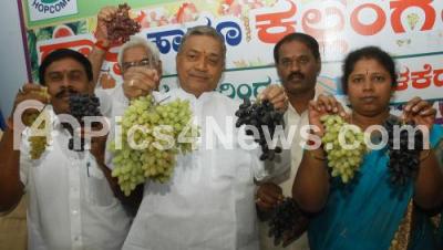 Photo Caption : SA Ravindranath, Horticulture Minister with Nagamani Chandrashekhar, President, Horticulture and others seen displaying Grapes, during the Grapes and Watermelon Mela at HOPCOMS, in Bangalore on Wednesday 13th February 2013