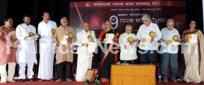 Photo Caption : Padmini Ramamurthy, MR Satyanarayana, Prof G venkatasubbaiah, HS Venkatesh Murthy, Hampa Nagarajaiah and others seen releasing the Souvenir during the 9th Gamaka Kala Sammelana at Gayana Samaj, in Bangalore on Thursday 21st February 2013