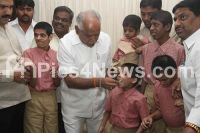 Photo Caption : BS Yeddyurappa, President, KJP celebrates his 71st Birthday with Matrushree Manovikasa Kendra Students at his residence, Dollars Colony, in Bangalore on Wednesday 27th February 2013